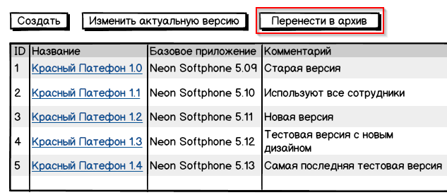 Версия, находившаяся в статусе Устаревшая, для которой истёк Срок работы устаревшей версии, или переведённая в данный статус из Устаревшей или Тестовой кнопкой Перенести в архив. Приложения данной версии не подключаются к личному кабинету и АТС, и для продолжения работы клиенту нужно будет обновить приложение до Актуальной или Тестовой версии. Версия в статусе Архивная не может быть переведена в другой статус; - Устаревшая: