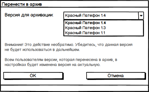В окне доступен выбор Версии для архивации (из версий в статусе Устаревшая и Тестовая). После выбора версии и нажатия ОК статус версии меняется на Архивная. Пользователям, у которых в настройках выбрана данная версия приложения, устанавливается Актуальная версия.