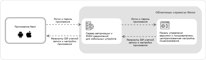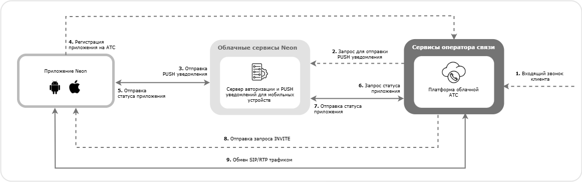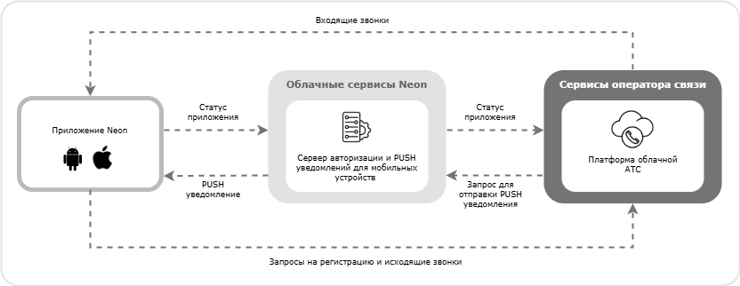 Для гарантированной доставки входящих звонков в мобильное приложение Neon Платформа облачной АТС оператора взаимодействует с облачным Сервером авторизации и PUSH уведомлений для мобильных устройств. Платформа облачной АТС отправляет звонки в мобильное Приложение Neon тогда и только тогда, когда получает от указанного Сервера информацию о готовности мобильного приложения Neon принять входящий звонок.