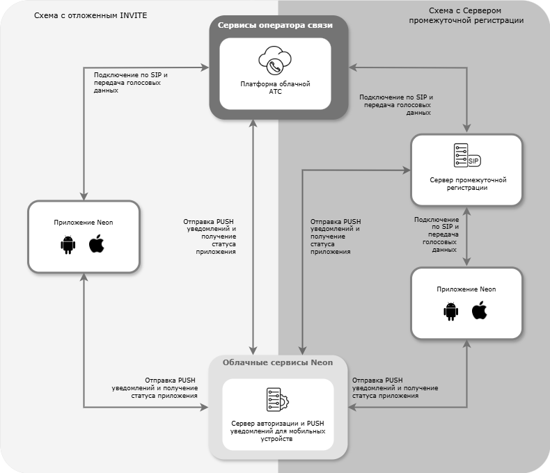 PUSH уведомлениев Приложение, сигнализируя телефону о скором поступлении звонка. После того, как Приложение Neon на смартфоне пользователя «проснется» и сообщит о готовности принять входящий звонок, Платформа облачной АТС отправляет звонок в Приложение Neon; - Схема с Сервером промежуточной регистрации(схема работы по умолчанию): приложение подключается к Серверу промежуточной регистрации, который подключается к