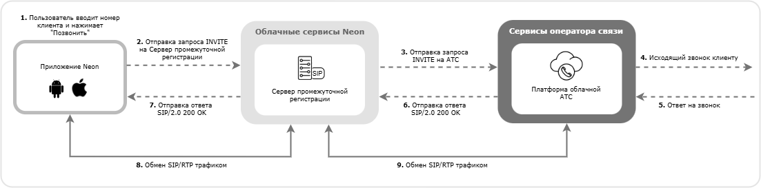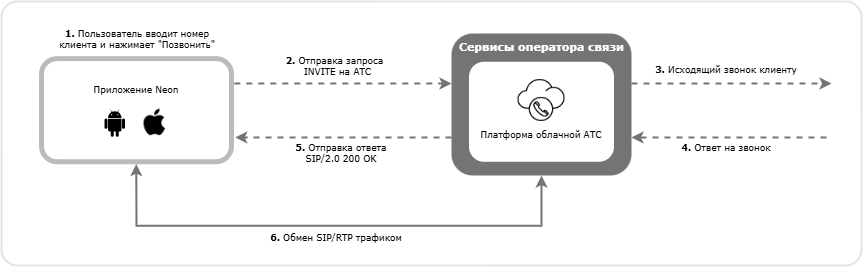 Схема совершения исходящего звонка Приложением Neon: