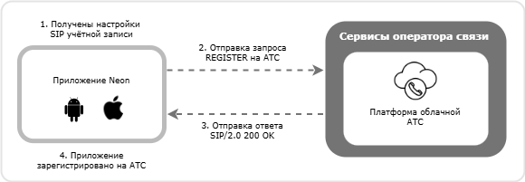 В указанной схеме работы мобильное приложение Neon регистрируется на Платформе облачной АТС оператора связи и взаимодействует с ней по SIP протоколу в соответствии с RFC 3261.