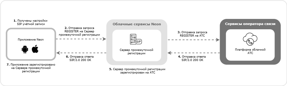 В указанной схеме работы мобильное приложение Neon регистрируется на Сервере промежуточной регистрации. Данный Сервер выступает в качестве посредника между Приложением Neon и Платформой облачной АТС оператора связи и взаимодействует с ними по SIP протоколу в соответствии с RFC 3261.