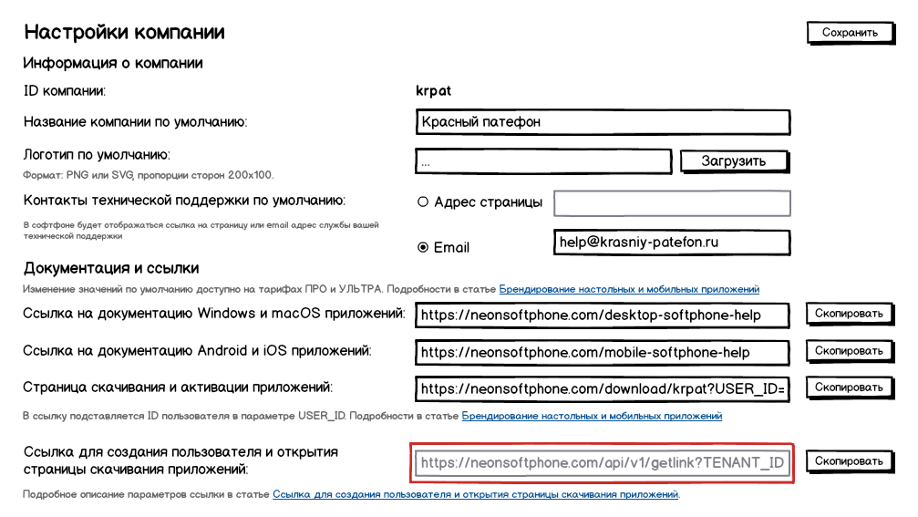 Получить ссылку для размещения в личном кабинете вашей АТС вы можете на странице Настройки компании вашей Панели управления версиями, пользователями и настройками Neon: