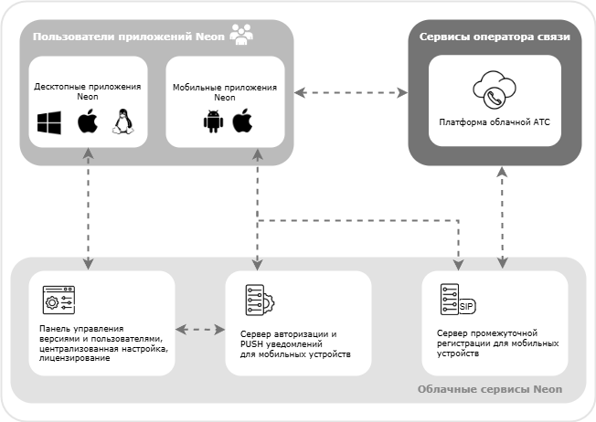 В данной статье приведено общее описание компонентов экосистемы приложения Neon для компьютеров и мобильных устройств, их взаимодействие между собой и с внешними АТС.