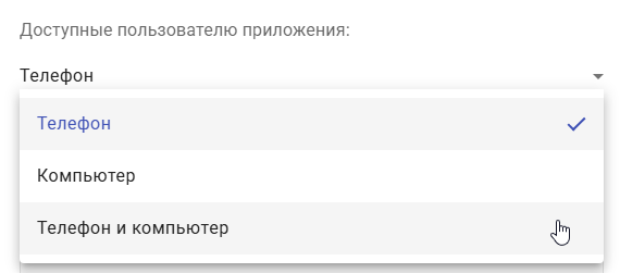 6. В выпадающем списке Доступные пользователю приложения выберите, какие приложения доступны новому пользователю и нужны ему для работы. Например, только мобильное приложение или мобильное и ПК: